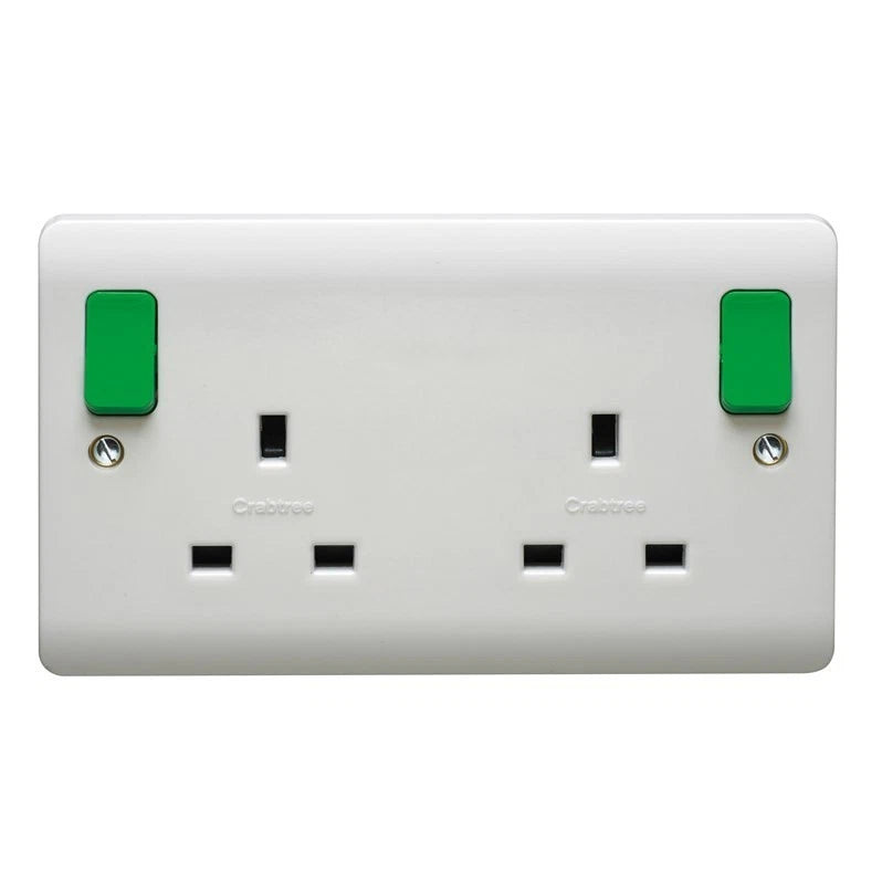 Crabtree Instinct 13A 2 Gang Outboard Switched Socket With Green Rocker CR1307/D/GR/W