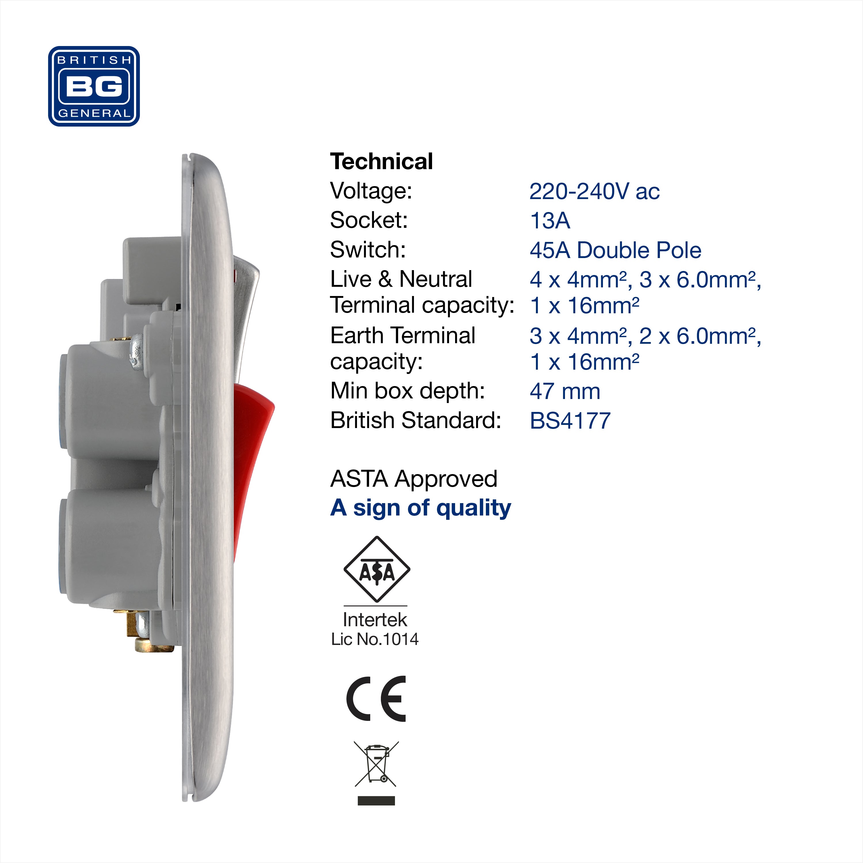 The NBS70G is a cooker switch with 13A socket from the BG Nexus Metal range, finished in brushed steel with grey inserts. This range of switches and sockets has been designed with a modern, slim profile and has a lightly lacquered surface to reduce fingerprint marks. The BG Nexus Metal range of switches and sockets comes with colour coded screws and has a full grid system to match.