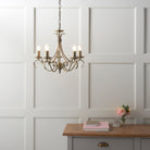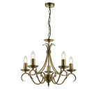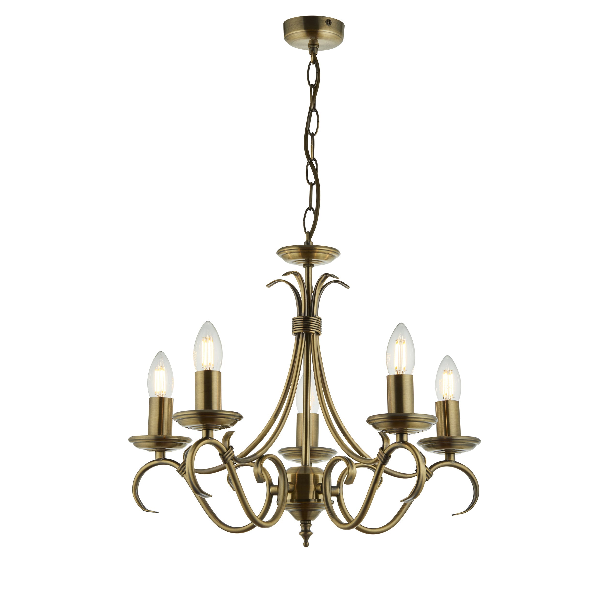 A 5 light ceiling fitting with scrolled arms in antique brass effect finish. suitable for use with LED lamps, height adjustable and dimmable. Matching items available and also comes in an antique silver finish