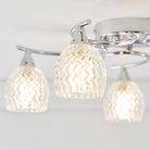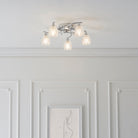 A 5 light flush ceiling fitting with curved metal arms in a chrome finish, and cut glass shades. suitable for use with LED lamps and dimmable. Matching items and other colour options available