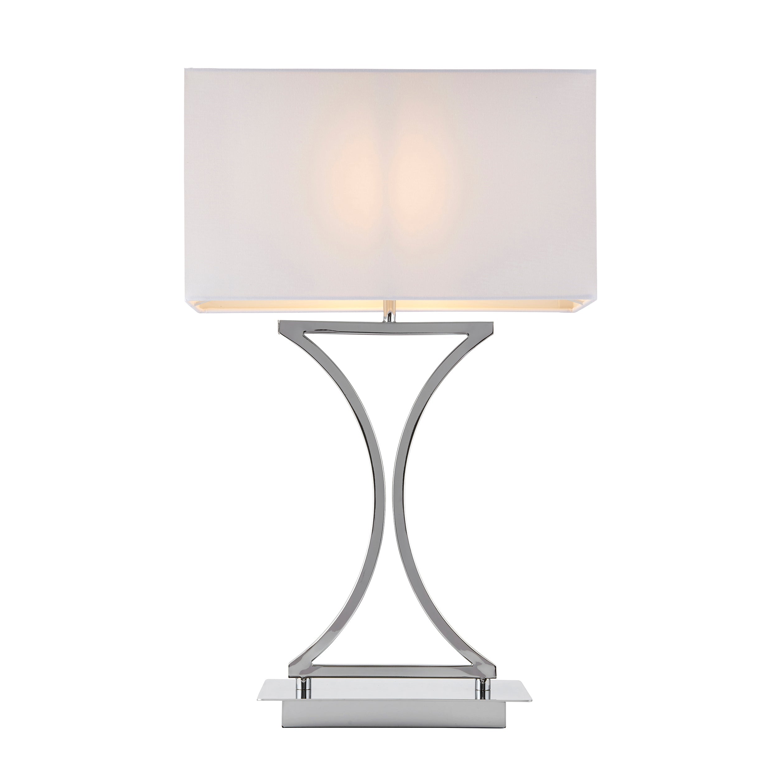 This table lamp features an unusually shaped body atop a rectangle base, all finished in chrome topped with white square shade. suitable for use with LED lamps and supplied with inline switch