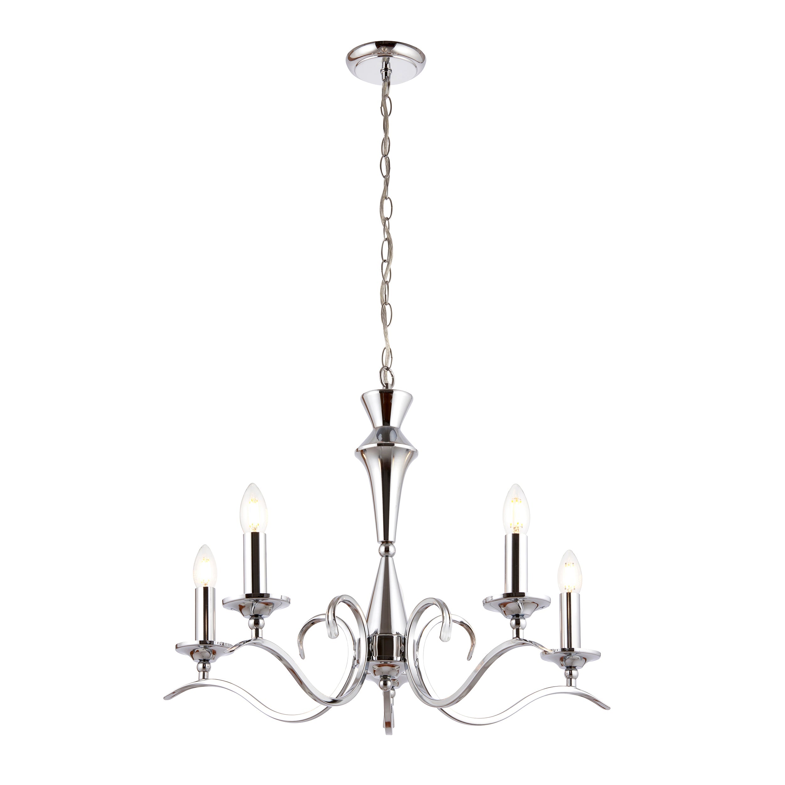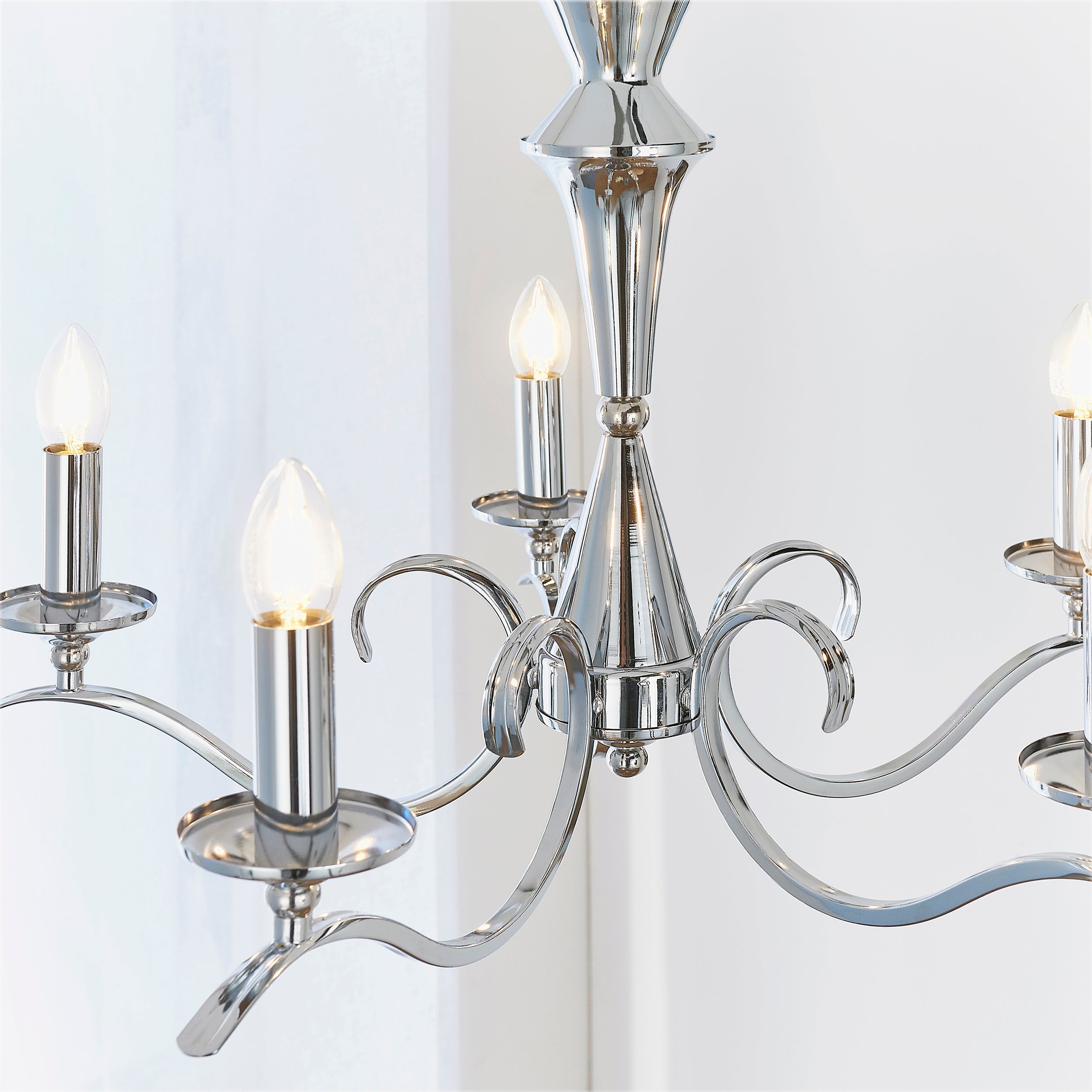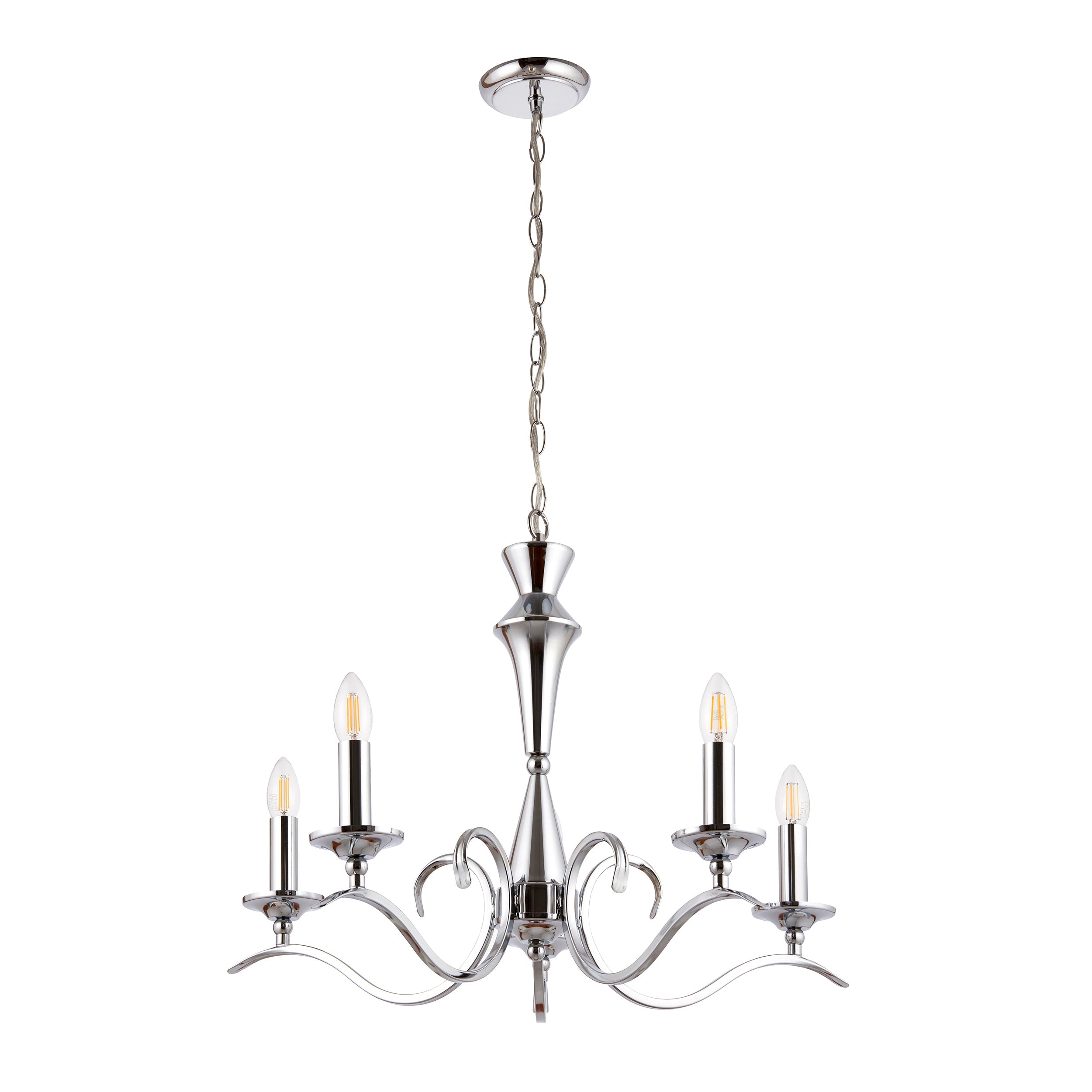 The Kora 5 light chandelier is finished in chrome effect, this fitting has an adjustable drop and can also convert to a flush fitting, is suitable for use with LED lamps and is dimmable. Also available in alternative finish and 8 light version
