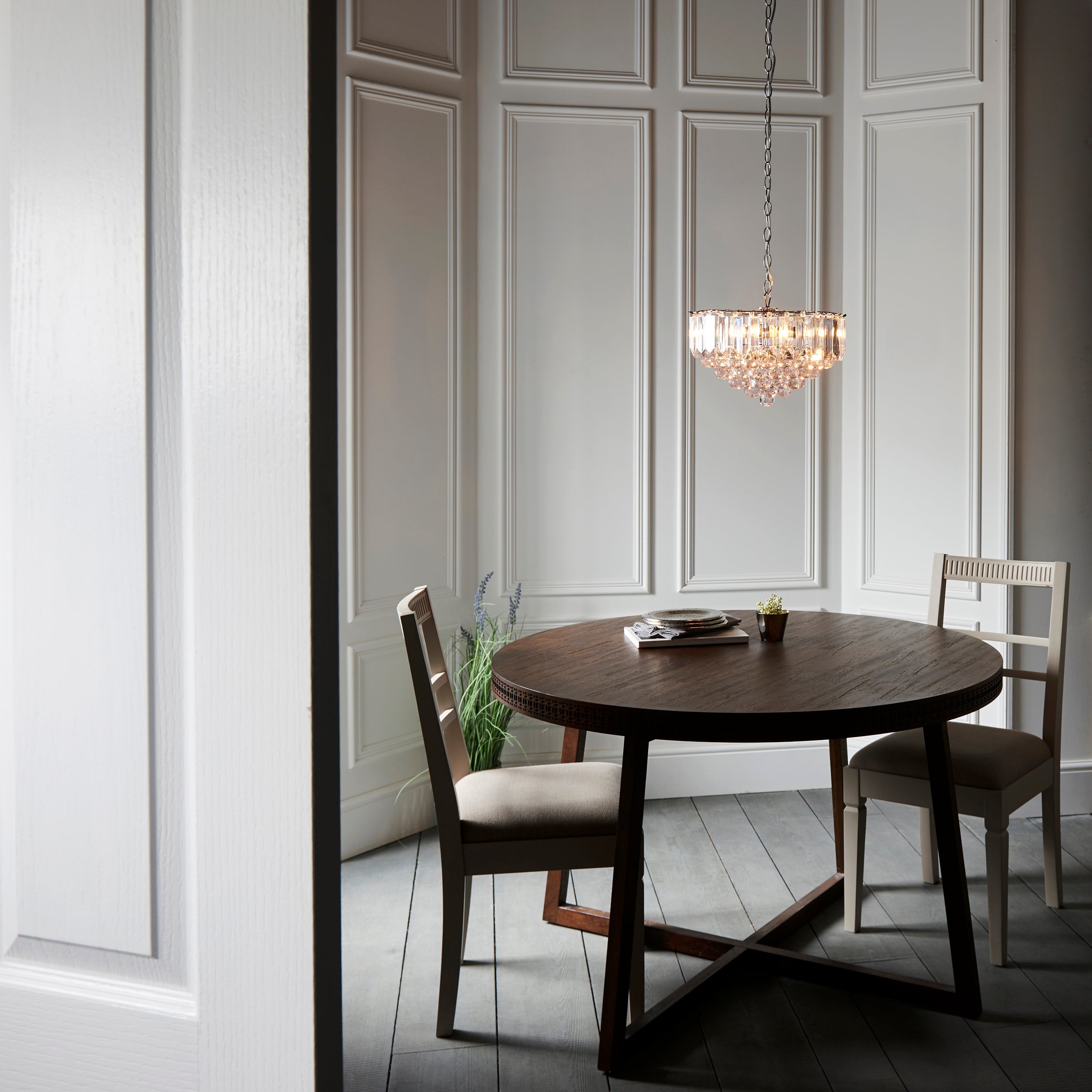 The Fargo pendant is finished in chrome effect with clear acrylic detailing. This fitting has a height adjustable drop, is dimmable and suitable for use with LED lamps. Other fittings and finishes also available within the range