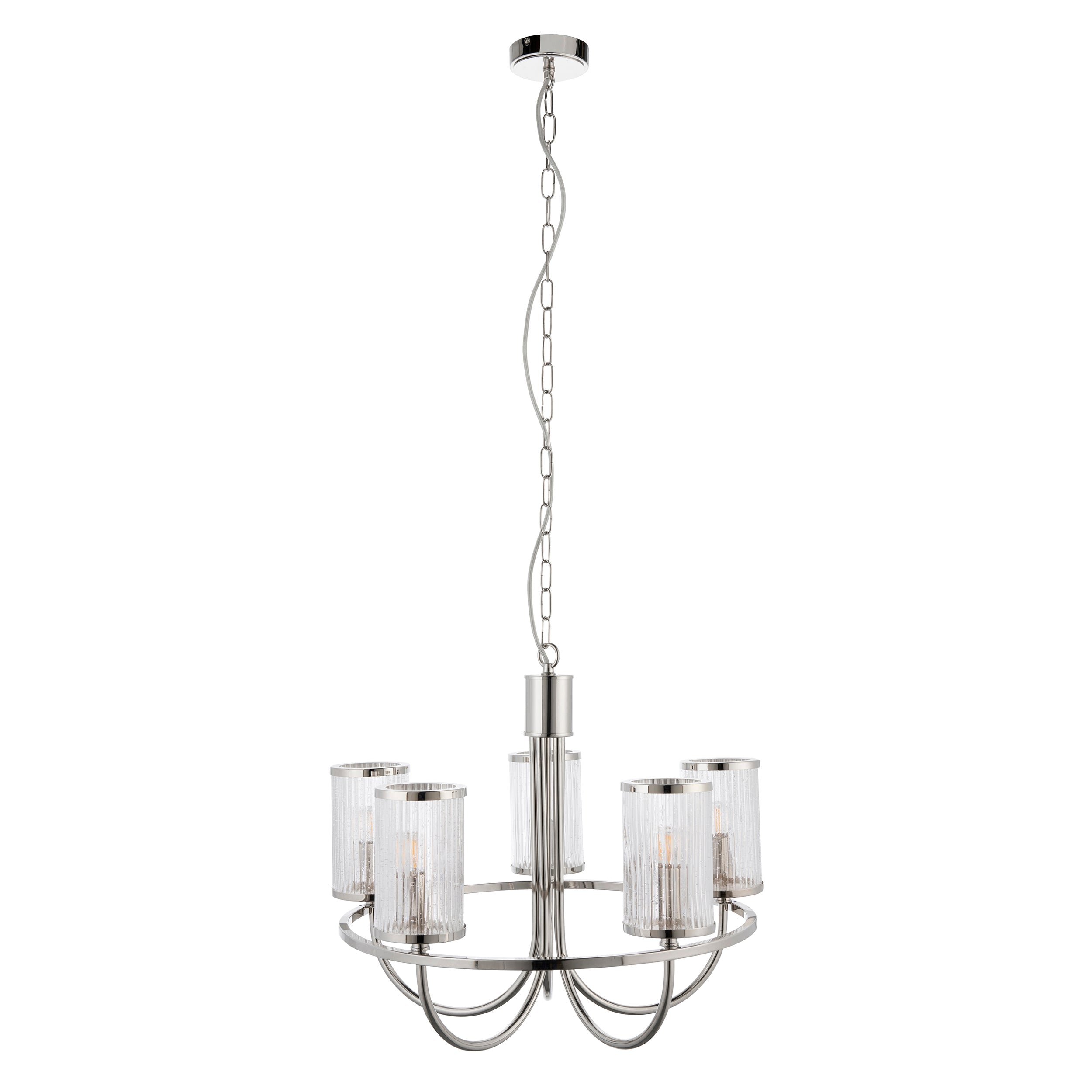The design of this five-armed pendant brings together old and new thanks to its classic curved design and bright nickel finish. The bubble glass of the ribbed cylindrical shades has a pleasingly aged appearance through which a gentle diffusion of light can pass.