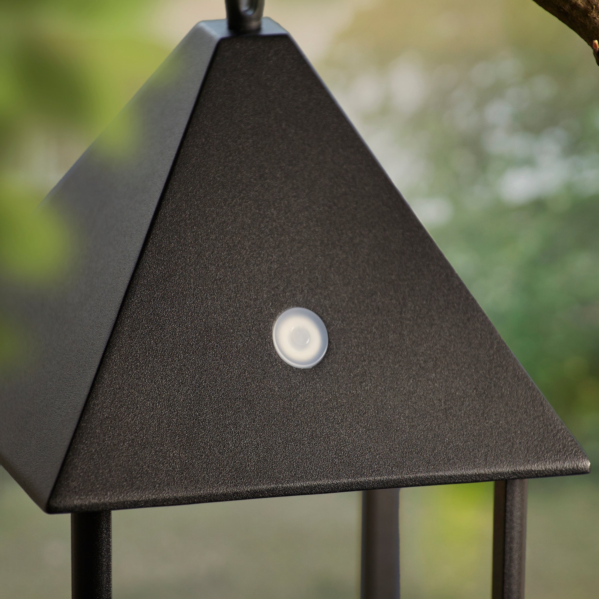 Light up your garden with character; this battery powered lantern is ideal for hanging in your outside space to create atmosphere. This modern bird house design can also be used as an attractive table light finished in a smart matt black. Also available in smaller size.