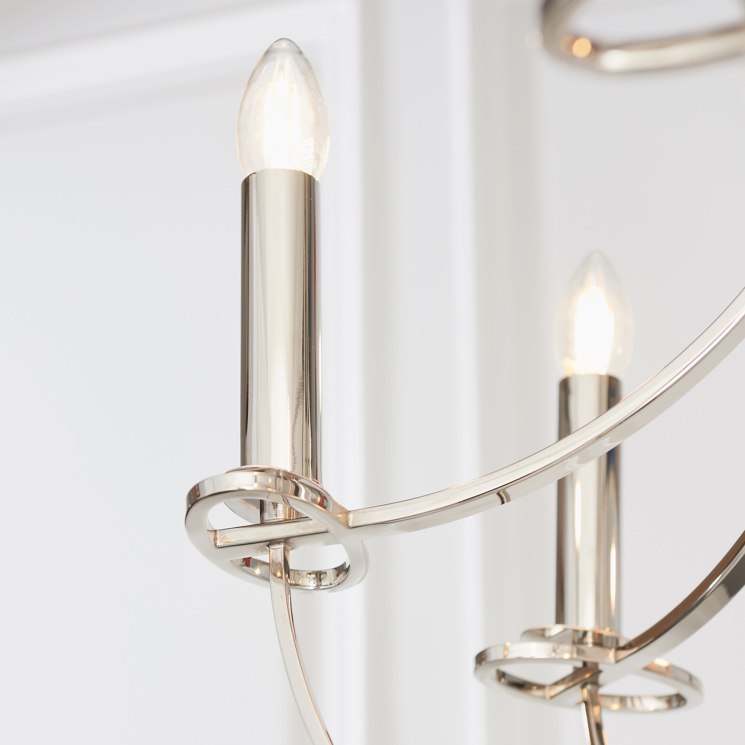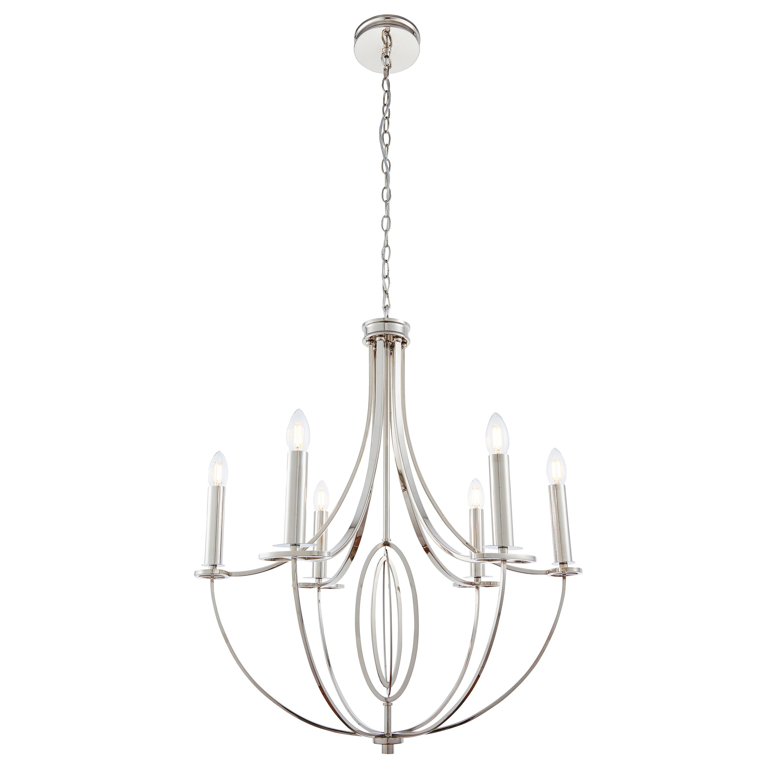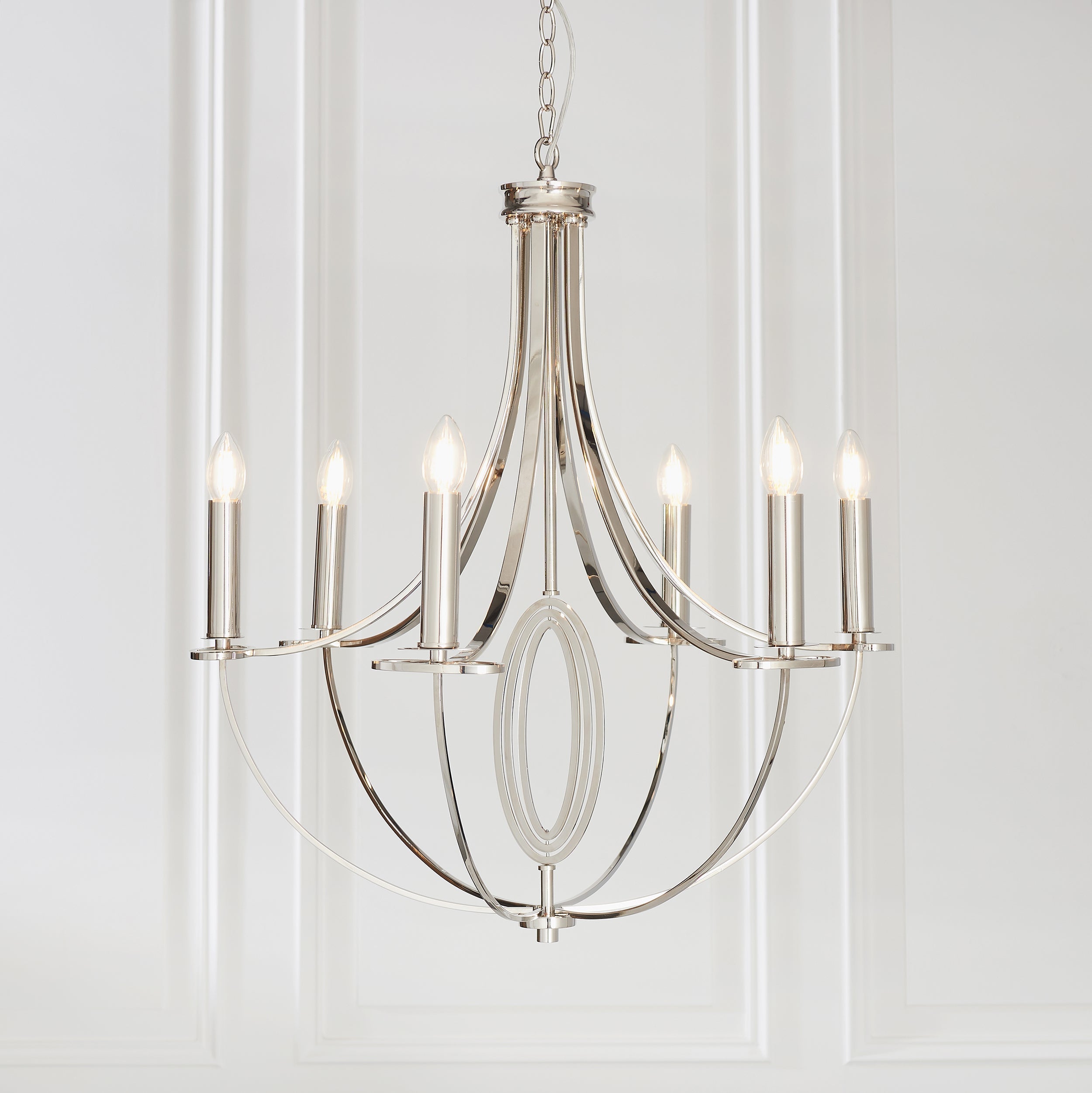 The Whistle is a simple 6 light fitting with a nickel plate finish. suitable for use with LED lamps, this fitting is also dimmable and has an adjustable drop. Medium sized pendant also available