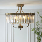A design classic, this glamorous semi-flush ceiling light works equally well in contemporary or classic interiors. This timeless antique brass ceiling light is surrounded by faceted glass which creates striking light patterns.