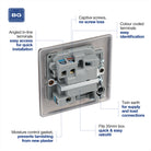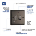 The NBN53 is a 13A switched spur with neon and flex outlet from the BG Nexus Metal range, finished in black nickel. This range of switches and sockets has been designed with a modern, slim profile and has a lightly lacquered surface to reduce fingerprint marks.