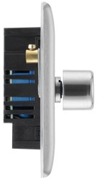 The NBS84 is a 4G dimmer switch from the BG Nexus Metal range, finished in brushed steel. This range of switches and sockets has been designed with a modern, slim profile and has a lightly lacquered surface to reduce fingerprint marks. The BG Nexus Metal range of switches and sockets comes with colour coded screws and has a full grid system to match.