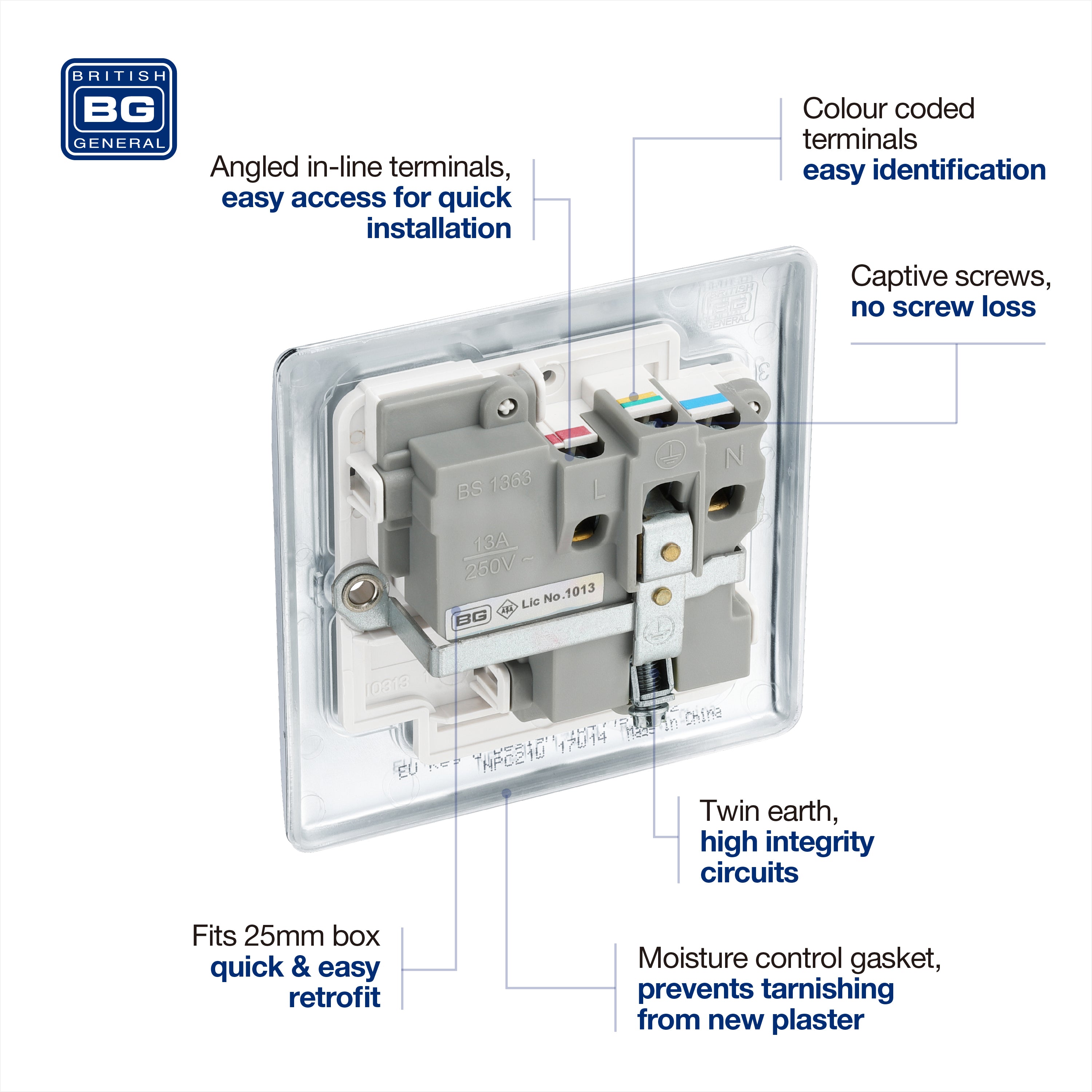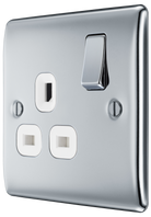 The NPC21W is a 13A single socket from the BG Nexus Metal range, finished in polished chrome with white inserts. This range of switches and sockets has been designed with a modern, slim profile and has a lightly lacquered surface to reduce fingerprint marks. BG Nexus Metal switches and sockets come with colour coded screws and has a full grid system to match.