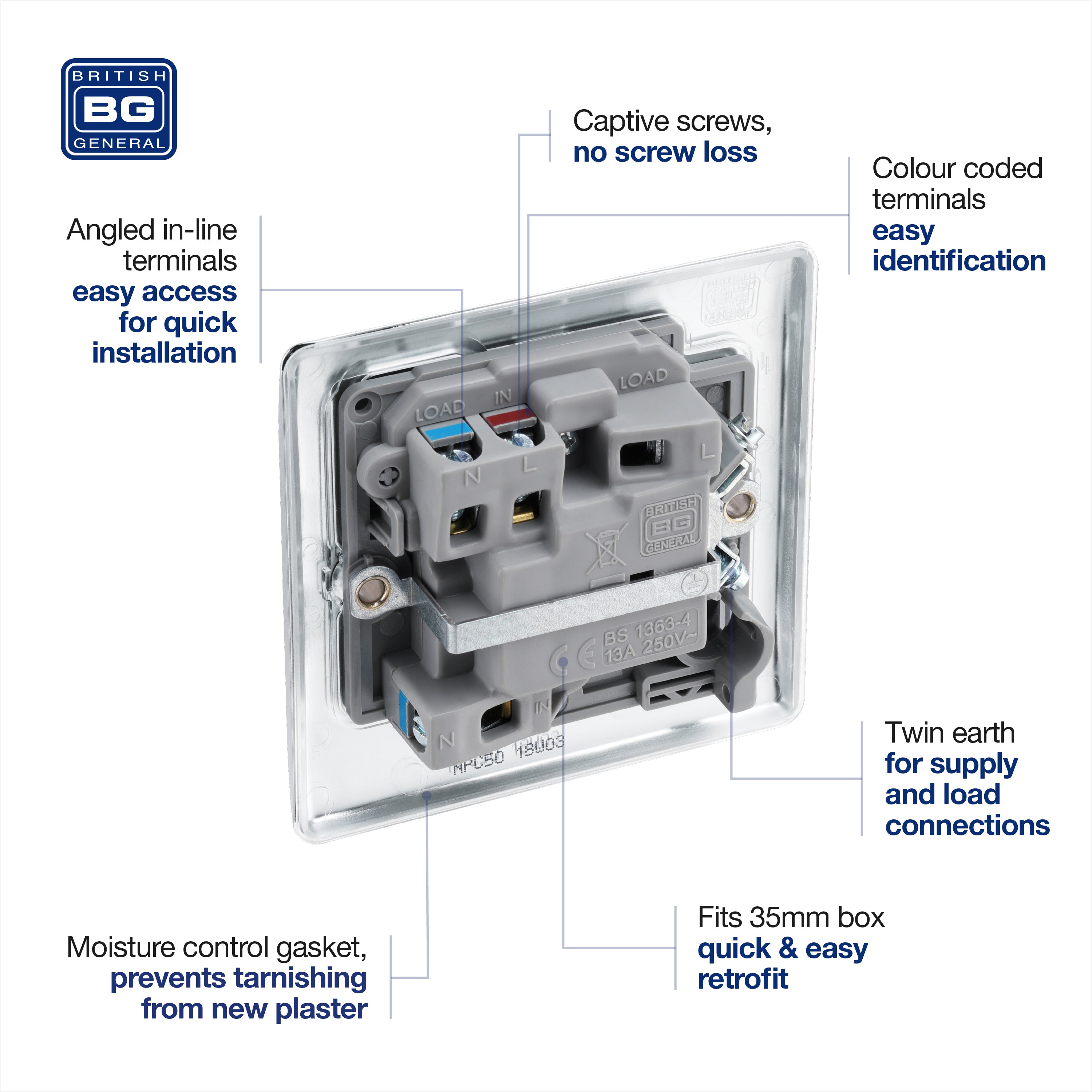 The NPC50 is a 13A switched spur from the BG Nexus Metal range, finished in polished chrome. This range of switches and sockets has been designed with a modern, slim profile and has a lightly lacquered surface to reduce fingerprint marks. BG Nexus Metal switches and sockets come with colour coded screws and has a full grid system to match.