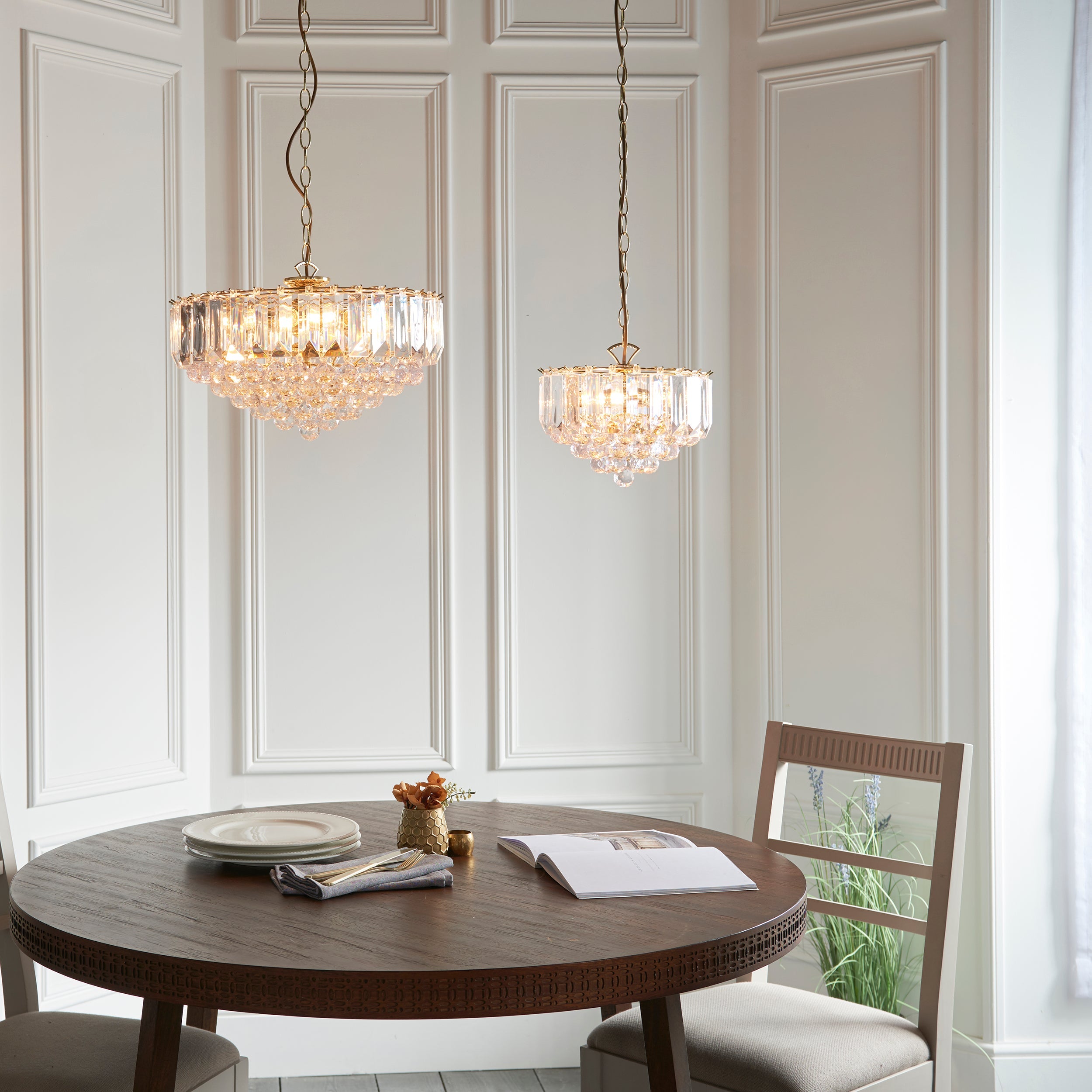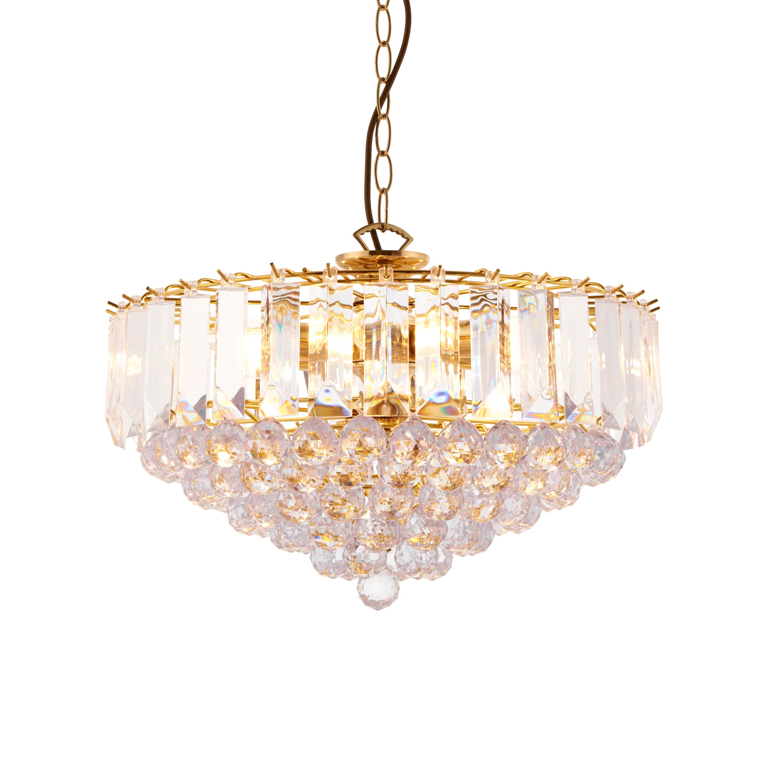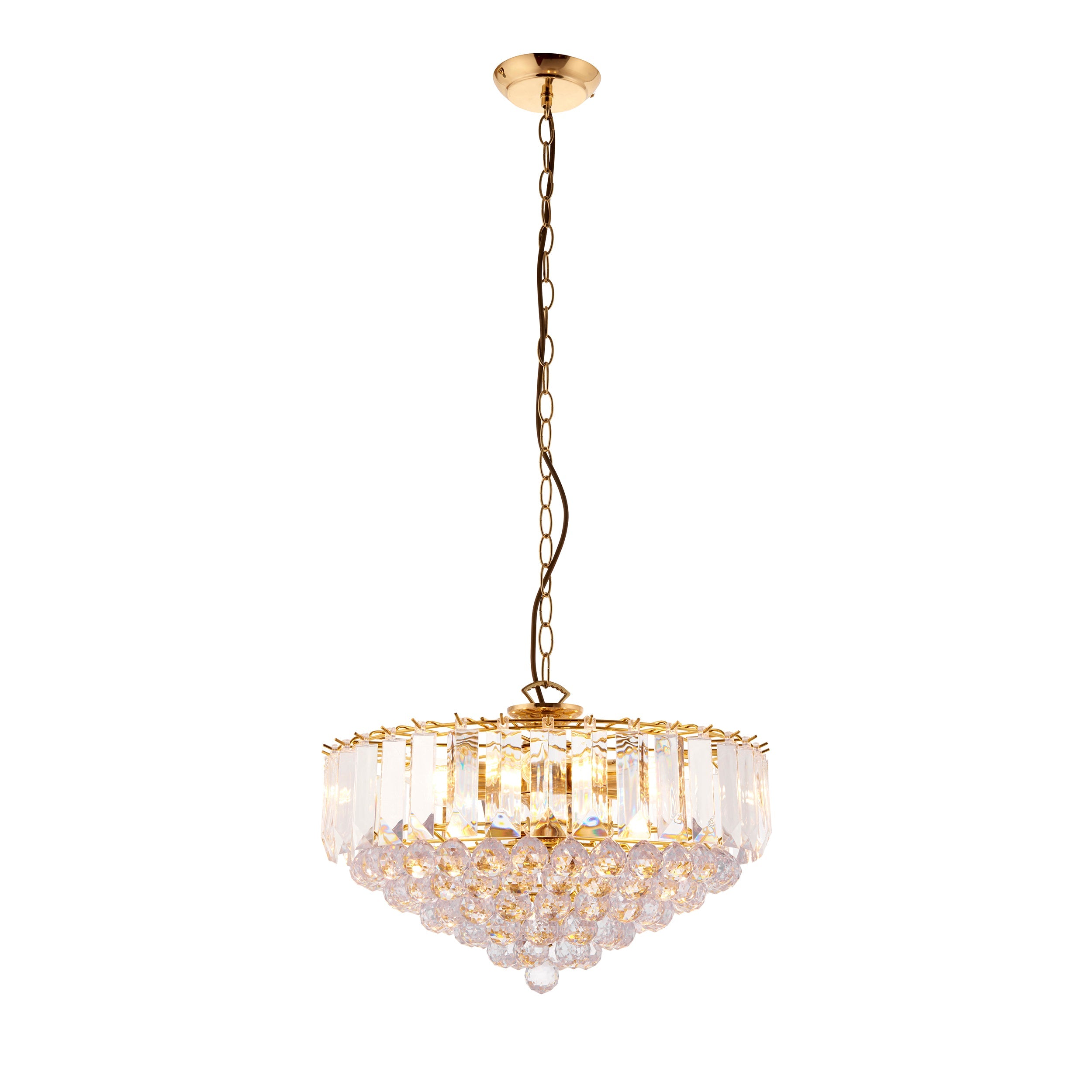The Fargo pendant is finished in brass effect with clear acrylic detailing. This fitting has a height adjustable drop, is dimmable and suitable for use with LED lamps. Other fittings and finishes also available within the range