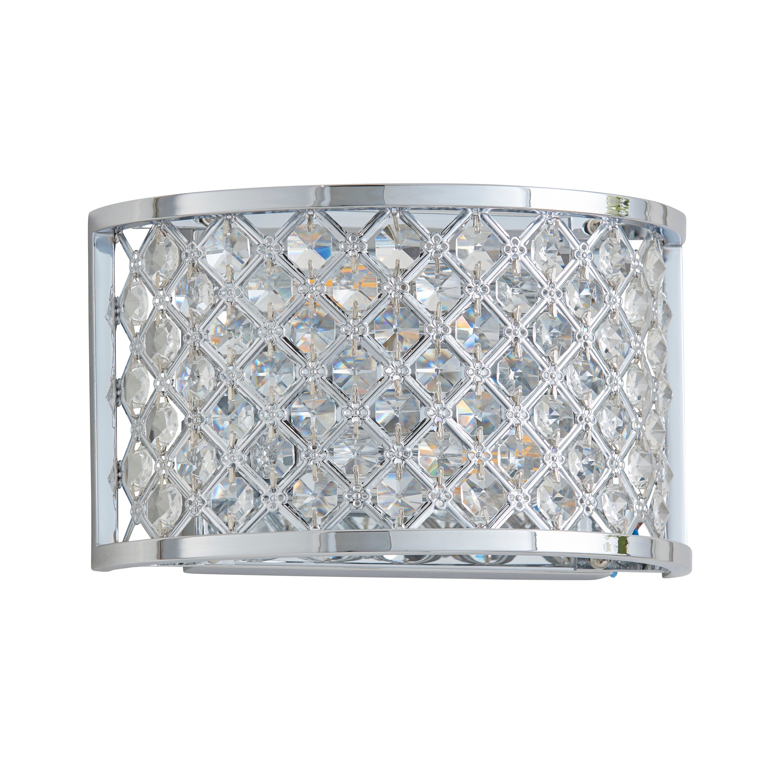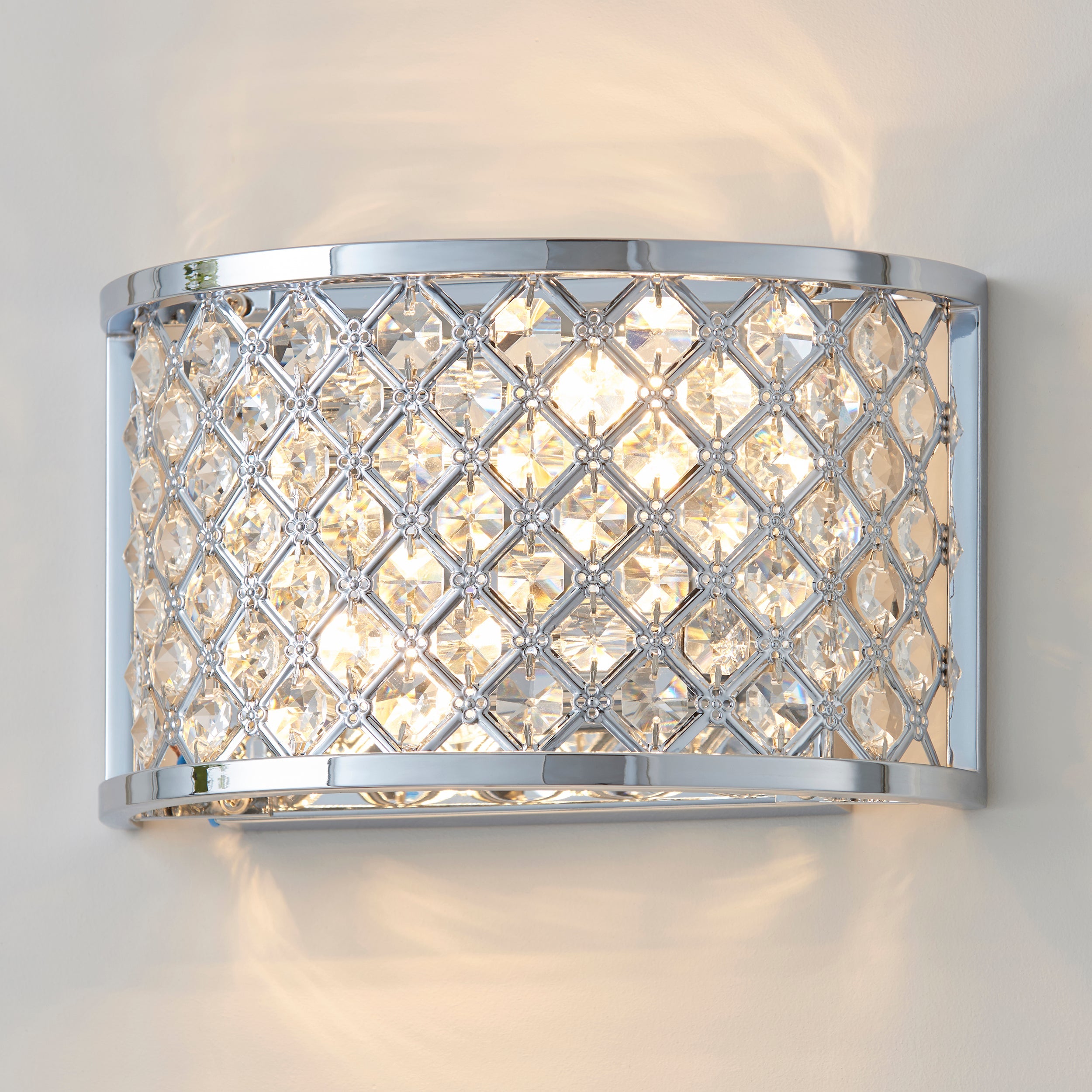 A 2 light wall fitting is made of crystal beads which sit inside the steel frame, all in a polished chrome finish. Dimmable and suitable for use with LED lamps. Matching items available