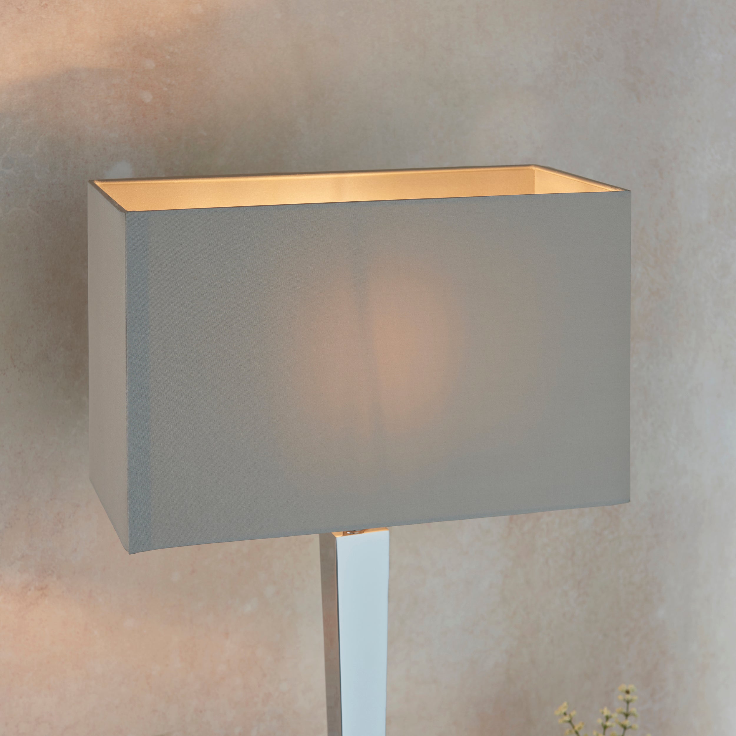 This table lamp has a tapered chrome effect plated stem, complete with a rectangular grey faux silk shade. Suitable for use with LED lamps and supplied with inline switch. Matching wall light available