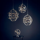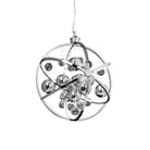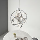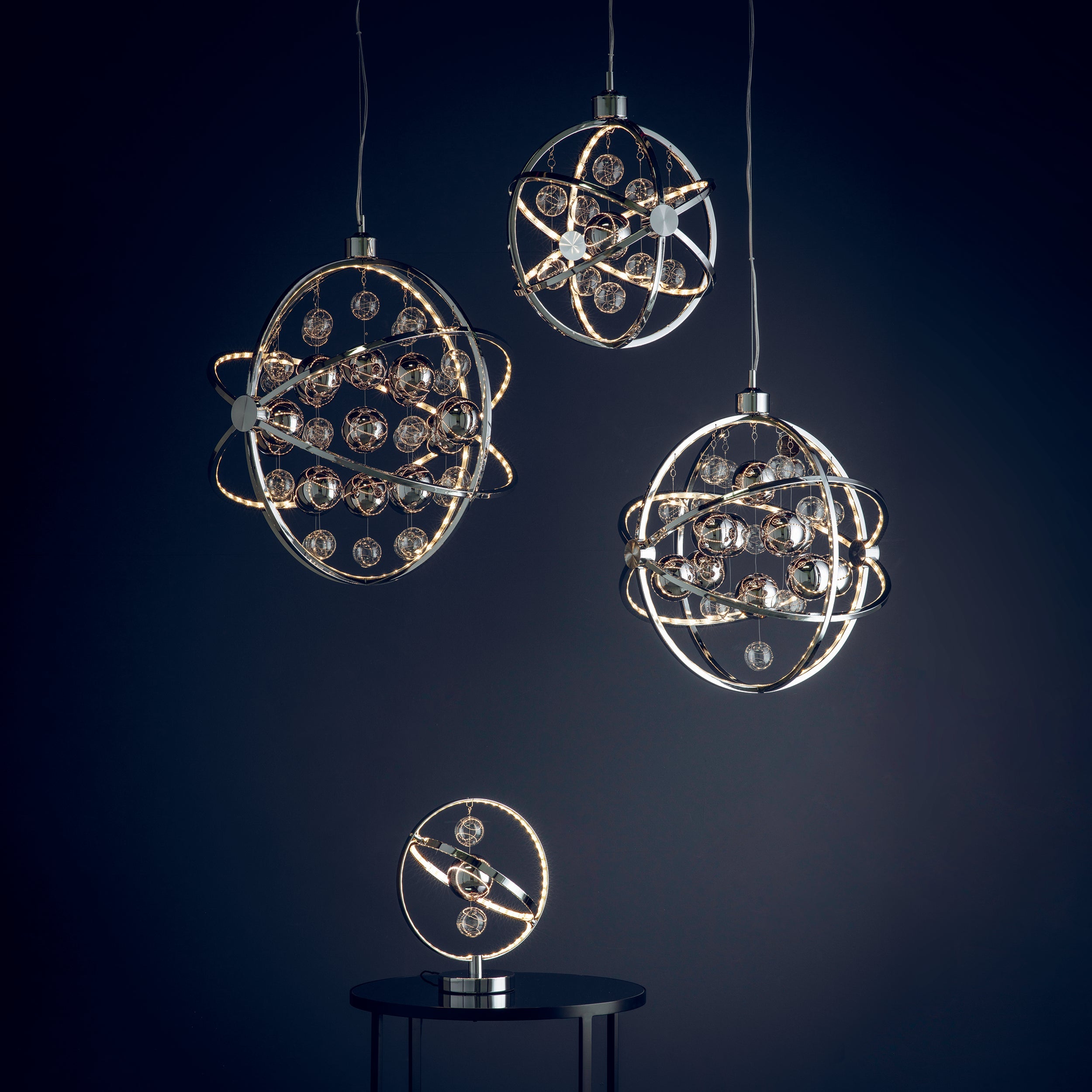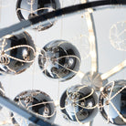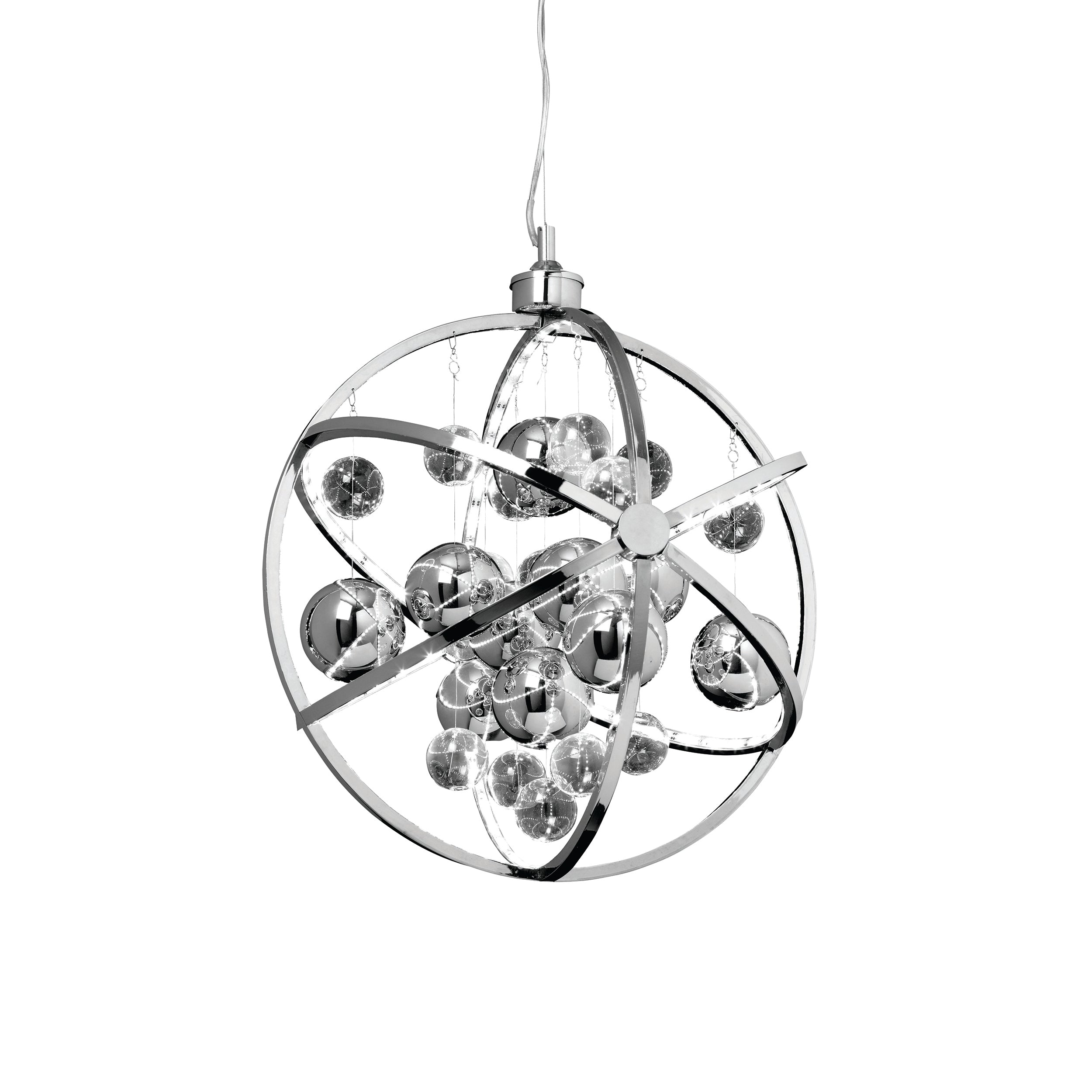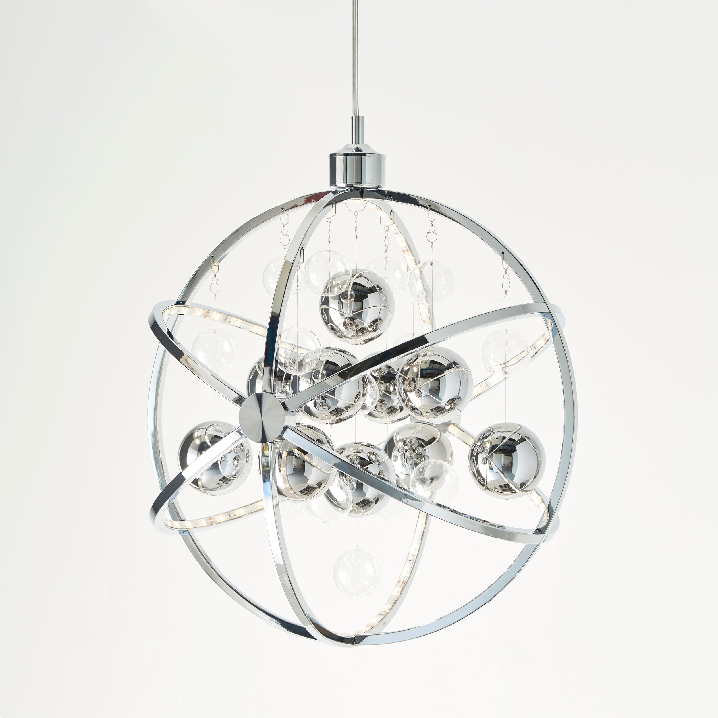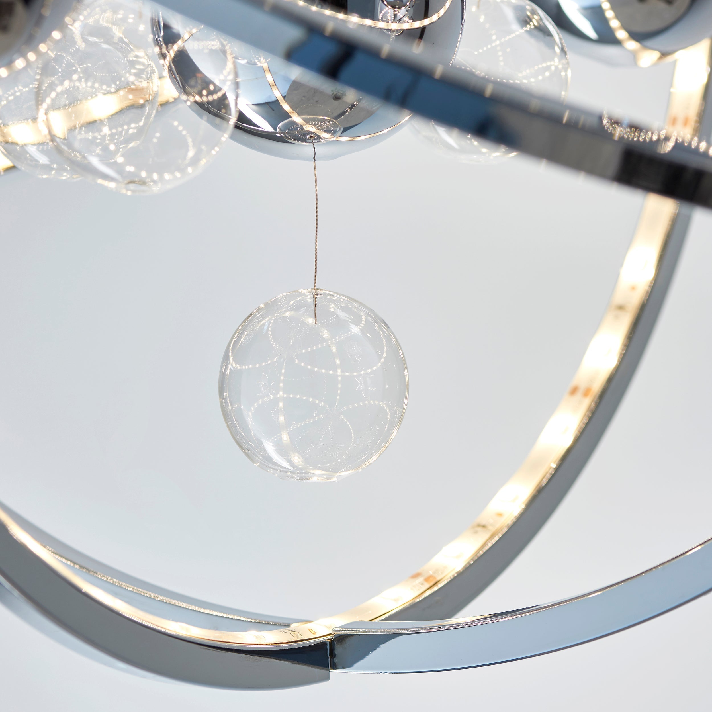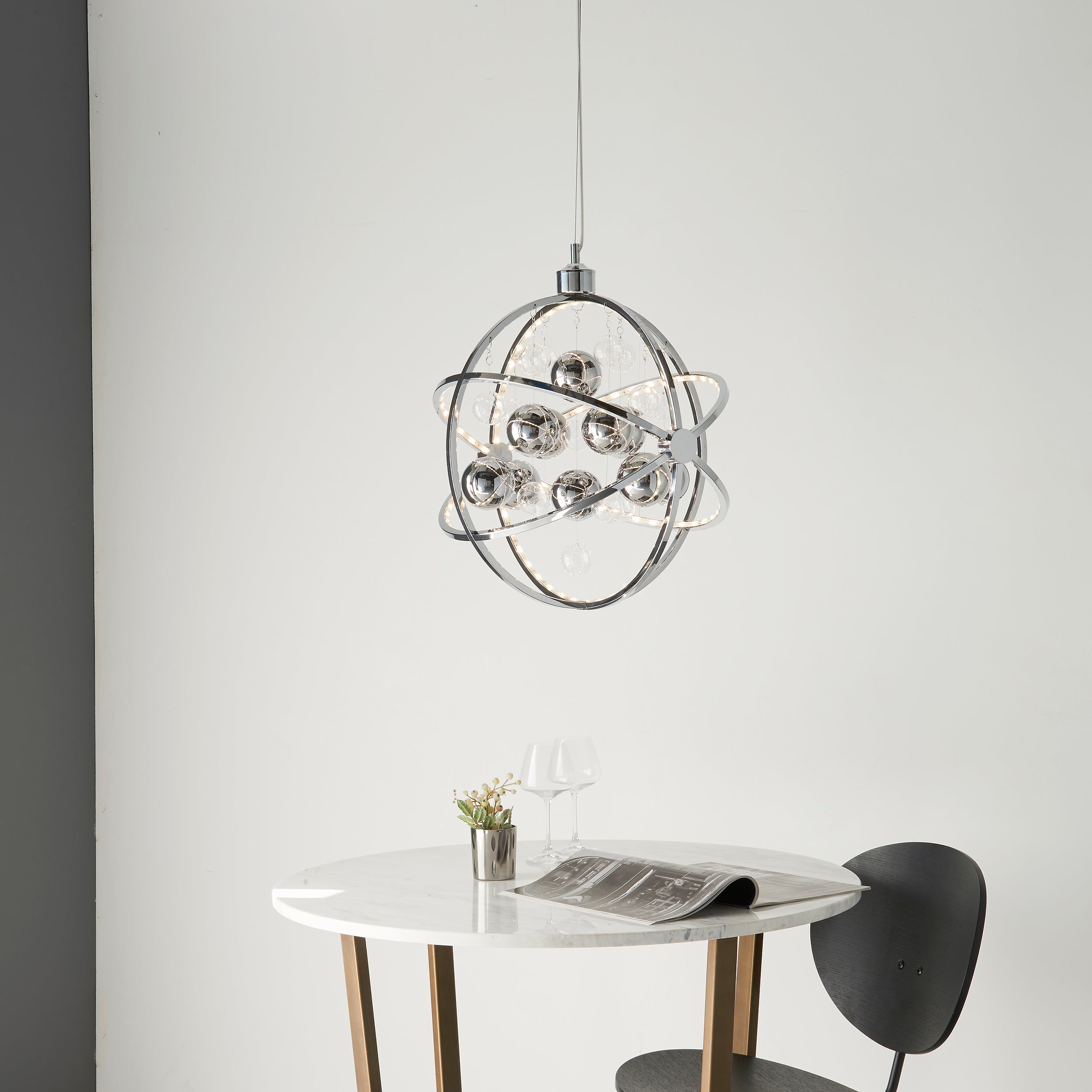 A striking LED pendant with a polished chrome finish with a mix of clear and chrome spheres suspended at various heights within the integrated LED outer rings, creating a stunning modern design.