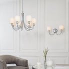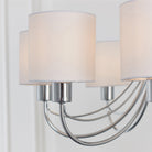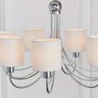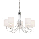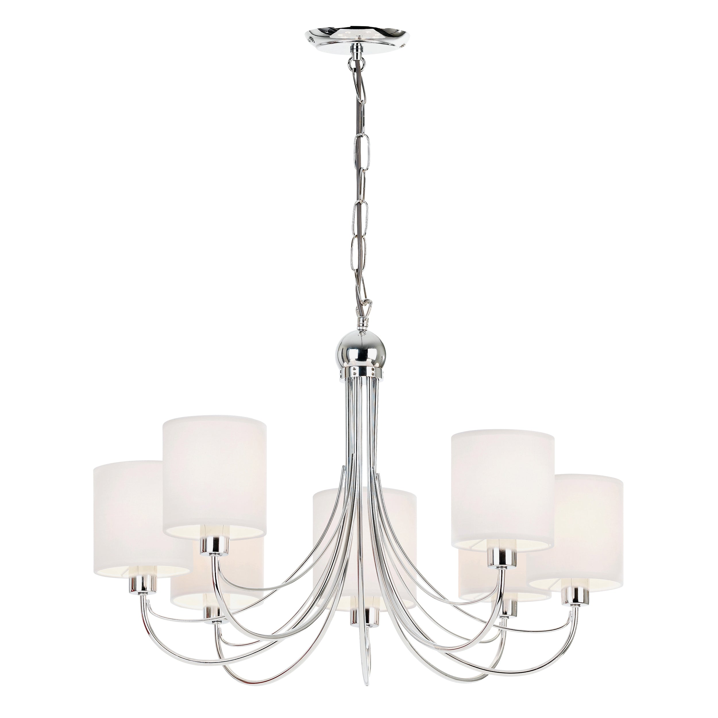 This 7 light pendant has a polished chrome finish and comes complete with white shades. Matching wall light and alternative finish available