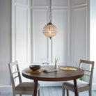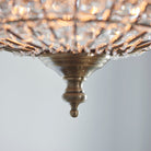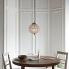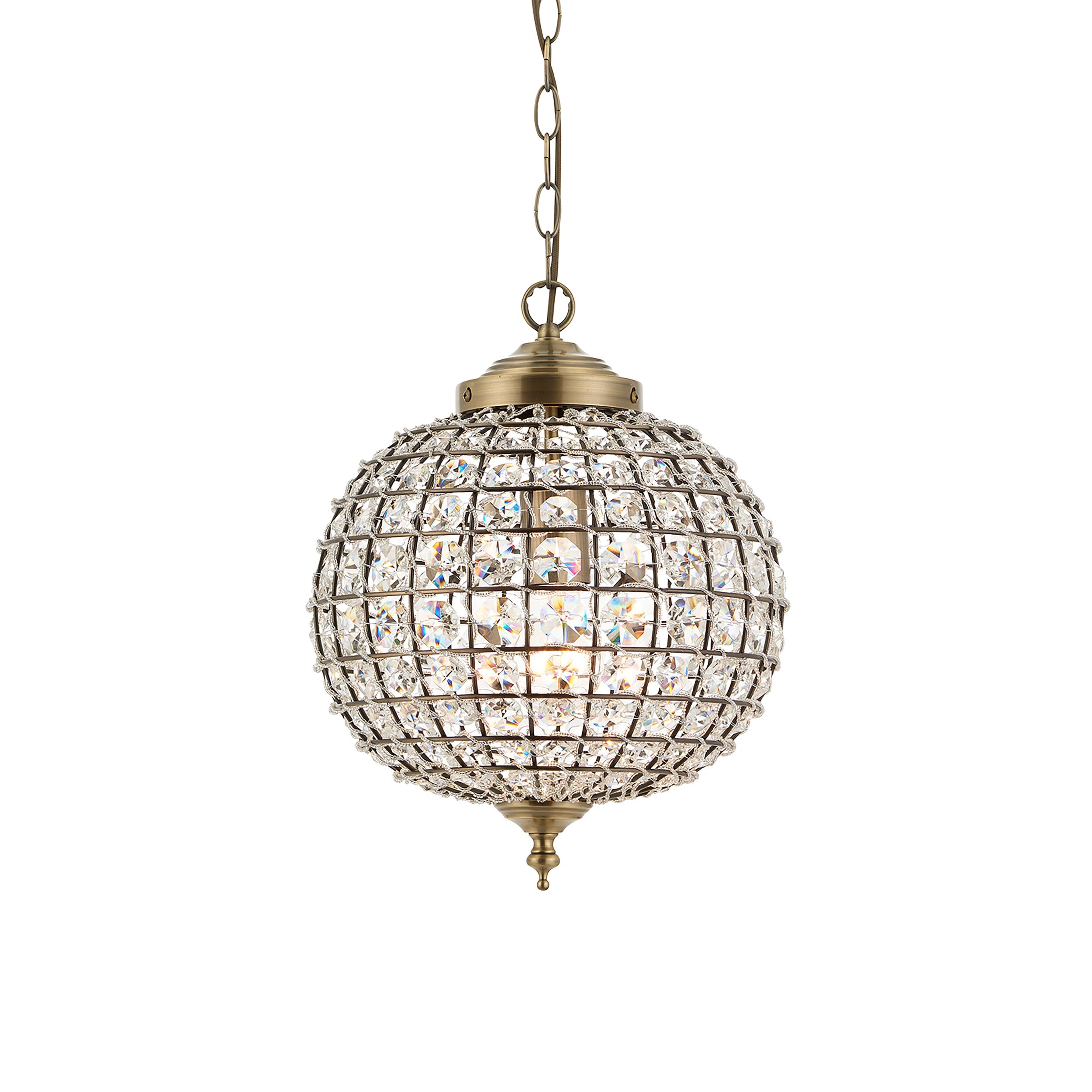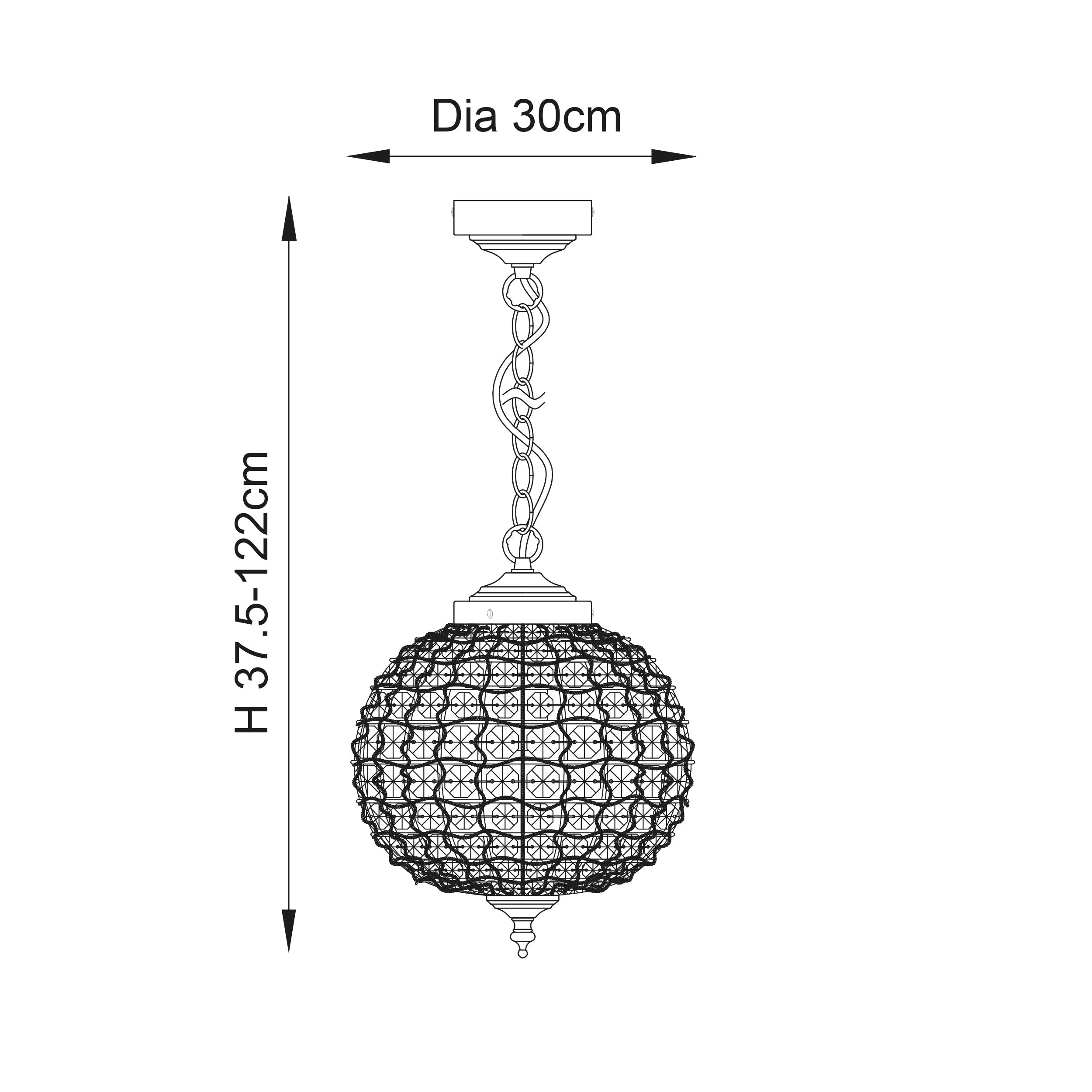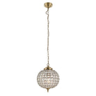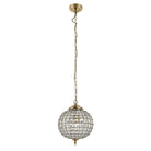 Single ceiling pendant with a dome shaped cage shade suspended by a decorative chain, all in an antique brass finish with clear glass bead detail. Height adjustable at time of fitting. Matching table light and alternative finish options also available